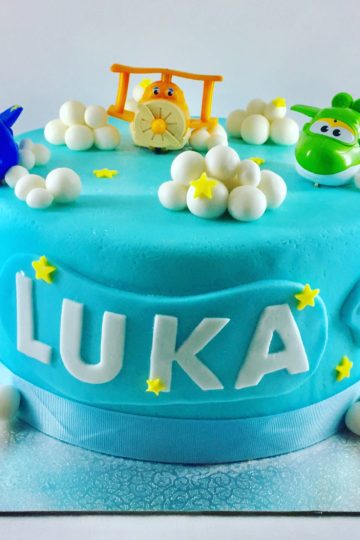 Tortica za navihanega Luka, ki obožuje letala in nebo ter praznuje svoj prvi rojstni dan. Tortica je oblečena v sladkorno maso fondant s figurami letal in imitacijo oblakov.
