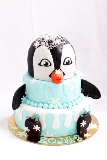 Za mlado Zojo, ki praznuje tretje leto svoje starosti in neverjetno navdušenko risanke pingvin. Torta v obliki pingvina v treh nadstropjih dveh različnih okusov.