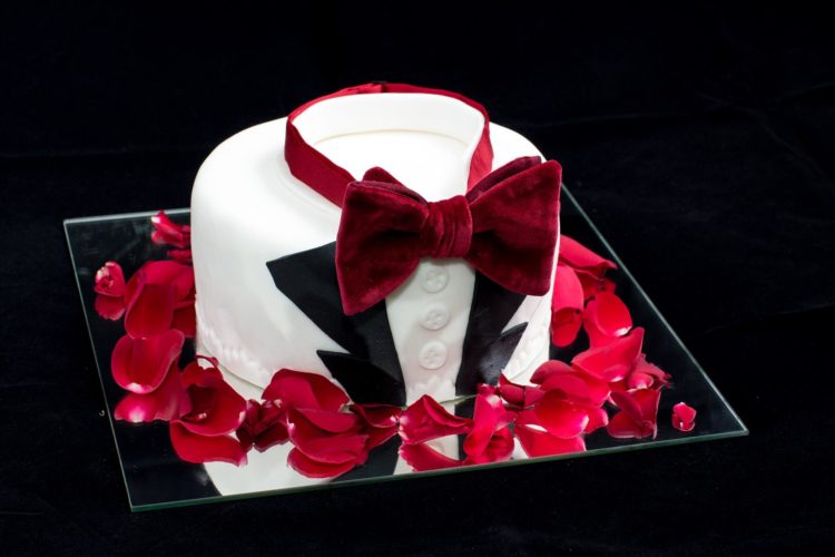 Čokoladna tortica za boljšo polovico v obliki moške elegant obleke in pravim mašljem. Podlaga za torto je ogledalo, okrog pa so posuti lističi vrtnice.