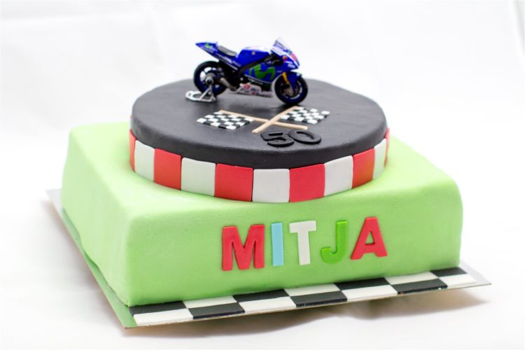 Za navdušenca motociklizma in Valentina Rossi, abrahamovca Mitjo, dvonadstropna torta v obliki ciljne ravnine motociklizma. Torta je v dveh nadstropjih.